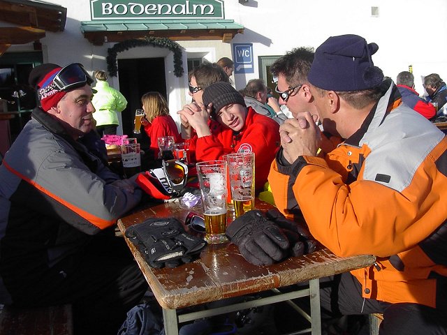 Für den zweiten Tag hatten wir uns einen ausführlichen Skitest vorgenommen. Pünktlich um 9.00 Uhr standen wir (geschrumpft auf fünf skibegeisterte Rudelzhausener – die anderen hatten wohl zu ausgiebig gefeiert und konnten nicht aufstehen) vor den Zelten der Ausrüster und wollten Skier ausleihen. Die Fischer- Ski waren schon weg, Völkl fing gerade an auszupacken. Etwa 15 andere Skifahrer warteten schon um Völkl Ski zu ergattern. Da wir nicht so lange warten wollten nahmen wir stattdessen das Angebot der beiden örtlichen Skischulen an und fuhren mit einem Skilehrer los um das Skigebiet zu erkunden und unser Fahrkönnen zu verfeinern. Zuerst fuhren wir mit dem 6-er Sessellift Gamskogel zur Mittelstation hoch. Unser Skilehrer Andy machte mit uns einige Übungen zum Aufwärmen. Dann sollten wir ihm zeigen wie gut wir schon Skifahren. Sein Kommentar: “ Ihr fahrt ja besser als ich !“ Zumindest bei Christian wird das wohl zum Teil auch richtig gewesen sein.  Einige Male fuhren wir die Weltcup-Abfahrt runter ins Tal. Dann ging es mit dem 2-er Sessellift bis zum Gamskogelgipfel hoch. Diese Abfahrt zur Mittelstation gefiel uns gut, so dass wir auch hier mehrmals fuhren. Wir wechselten dann zur anderen Talseite und fuhren mit der 6-er Sesselbahn Tauernkar auf den Berg. Der obere Bereich dieser Abfahrt war ziemlich steinig, dennoch fuhren wir nochmals hoch, da wir auf der Rauchkopfhütte (Eigentümer war der Onkel unseres Skilehrers) Mittagspause machen wollten.