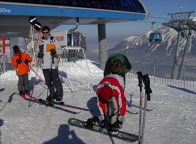 Unsere Busleiterin Michaela besorgte wieder die Skipässe, während wir uns anzogen und für den Skitag vorbereiteten. Da strahlender Sonnenschein bei bestem Winterwetter herrschte machten sich alle sofort auf den Weg zur neuen 8-er Gondelbahn. Obwohl schon sehr viele Skifahrer da waren, mussten wir kaum warten. Schnell erreichten wir die Bergstation am Brandstadl.