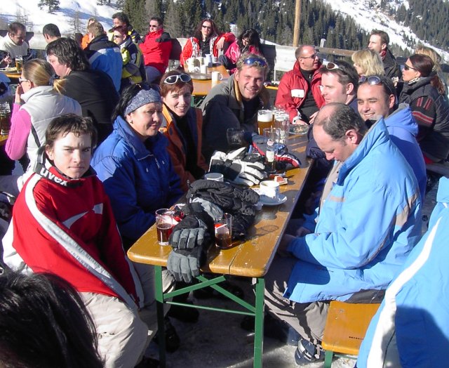An der Harbachalm trafen wir einige andere Skifahrer des Skiclubs, die hier Mittagspause machten. Wir hatten aber nur ganz kurz Zeit der Lifemusik zuzuhören, bevor wir wieder weiter fuhren. Über das sogenannte „Paradies“ fuhren wir jetzt einige Male ins Tal nach Großarl und immer mit der 6-er Gondelbahn gleich wieder hoch.