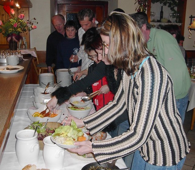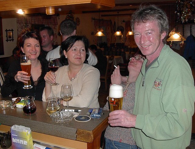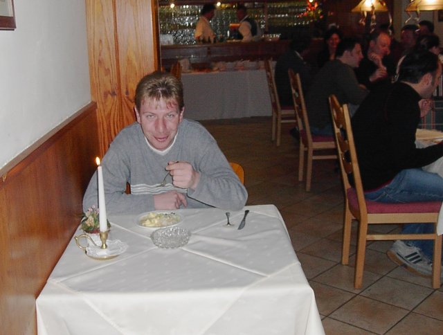 Der Hüttenwirt erwies sich als ein altes, aber neu renoviertes Gasthaus mit schönen geräumigen Zimmern. Nachdem wir die Zimmer bezogen, unsere Skischuhe im bestens geheizten Skischuhraum untergebracht und uns frisch gemacht hatten, ging es schon zum Essen. Das Essen (Salat vom Buffet, Suppe, Hauptspeise und Eis) wurde schnell serviert und schmeckte wirklich gut. Jeder sollte satt geworden sein.