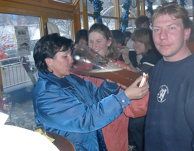 In der Yeti-Bar steppte schon der Bär. Apres-Ski war angesagt. Es wurde getanzt und gefeiert. Ralf spendierte ein Riesenweißbier (3-Liter-Glas).