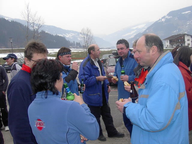 Der Wirt kannte natürlich „Speil“ und Georg noch, da die Feuerwehr Enzelhausen, dort schon zweimal ein Wochenende verbracht hatte. Ein „Wiedersehens-Schnaps“ wurde spendiert. Wir machten gemütlich Mittag, bevor wir mit der Nordhangbahn und dann mit der 6-er Sesselbahn „Knorren“.zum Penken hochfuhren. Nach einer Abfahrt Richtung Mayrhofen und einer Auffahrt mit dem Penkenexpress, fuhren wir Richtung Bergstation Horbergbahn runter. Noch einmal ging es mit dem „Lärchwaldexpress“ zum Penken hoch, bevor wir uns auf den Weg ins Tal machten. Da die Talabfahrt mangels Schnee gesperrt war, fuhren wir mit der Horbergbahn runter.