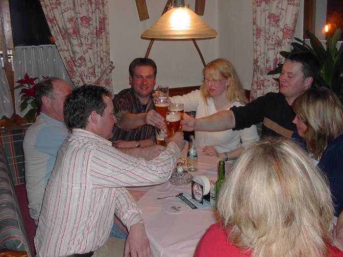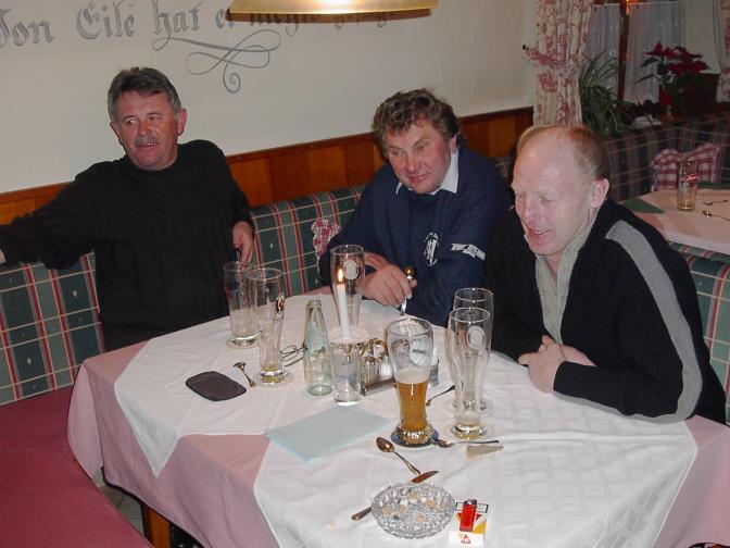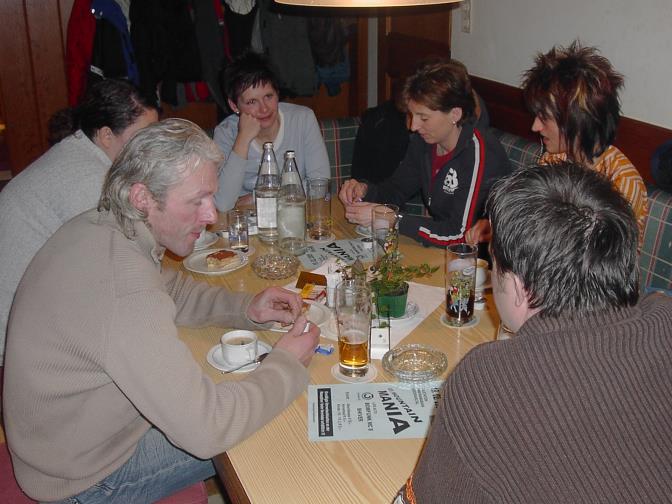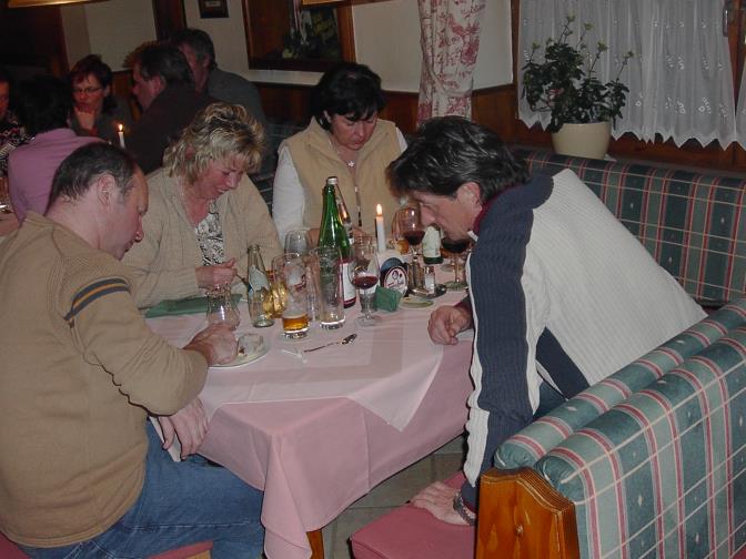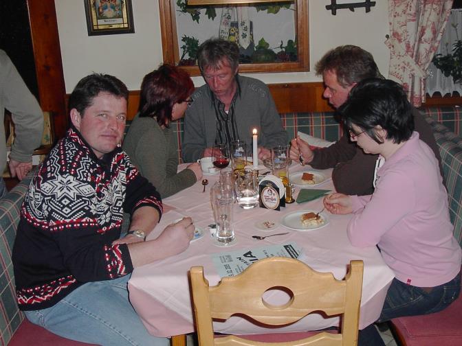 Gegen 17 Uhr trafen wir beim Hüttenwirt in Hüttschlag ein. Die Zimmerverteilung machte zwar ein paar Probleme, aber Conny meisterte alles mit der Wirtin in gewohnter Manier. Nachdem wir die Zimmer bezogen, unsere Skischuhe im bestens geheizten Skischuhraum untergebracht und uns frisch gemacht hatten, ging es zum Gastraum, wo wir uns aufs Essen vorbereiteten.