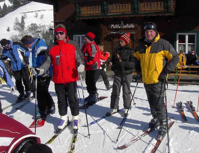 Anschließend fuhren wir zur Harbachalm ab. Hier waren die Pisten entlang der 6-er Sesselbahn Kreuzkogel angesagt. Dann war es Zeit um Alois abzuholen. An der Bergstation der Panoramabahn trafen wir ihn mit jetzt vollständiger Ausrüstung. Erneut fuhren wir zur 6-er Sesselbahn Harbach und dann zur 6-er Sesselbahn Kreuzkogel. Jetzt wechselten wir über die Kühageralmbahn ins Skigebiet von Dorfgastein. Da wir gut drauf waren nahmen wir uns dort gleich die 1150 Höhenmeter runter ins Tal vor. An der Mühlwinkelhütte hielten wir aber an, da es langsam Zeit wurde um an die Mittagspause zu denken. Die Skihütte war noch leer, außer einem Tisch, an dem schon eine andere Gruppe aus unserem Bus saß.