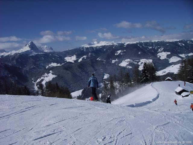 Und schon konnte es losgehen. Mit der 8-er Gondel Korer ging es ins Skigebiet. Doch bald merkten wir, dass wir mit der falschen Gondel unterwegs waren. Sie führte nur zum Übungshang und endete daher schon bald. Aber was soll es. So „übten“ wir eben auf dem flachen Hang während wir zur 8-er Gondel Kronplatz 2000 fuhren. Dieses Mal ging es aber wirklich um 1300 Meter höher bis zum Gipfel des Kronplatzes. Da an der Talstation keine Skifahrer gewartet hatten entschieden wir uns gleich für einen Talabfahrt. Auf der schwarzen Piste „Sylvester“ ging es zurück ins Tal. Die Abfahrt war super zu befahren, allerdings auch schon mit einigen „Buckeln“ versehen. Dann fuhren wir wieder nach oben, dieses Mal aber mit der 8-er Gondelbahn Kronplatz I + II. Da wir alle Lifte ausprobieren wollten, war gleich die Abfahrt zur nächsten Gondelbahn „Ruis“ angesagt. Der Schnee war super weich, die Piste aber nicht zu leicht zu befahren, da sich im weichen Schnee schon viele Buckel gebildet hatten. So mussten wir ganz schön konzentriert fahren. Wieder oben am Gipfel fuhren wir zum Furkelpass ab und dann mit der Gondel „Pre de Peres“ auf die andere Seite des Furkelpasses hoch.