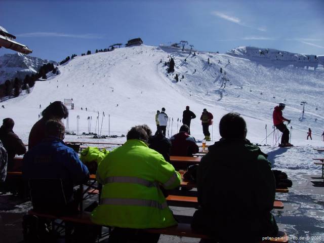 Mit einem kurzen Sessellift fuhren wir zum Piz Seteur hoch, dann gleich zum Plan del Gralba ab. Hier fuhren wir mit der 4-er Sesselbahn nochmals zum Piz Seteur hoch und wollten dort in der Skihütte Pause machen. Die Skihütte war aber überfüllt, so dass wir gleich nochmals, dieses Mal extrem schnell auf der schönen Piste zum Plan del Gralba abfuhren. Hoch ging es dieses Mal mit der Gondelbahn zum Piz Sella und von dort fuhren wir dann zur Sesselbahn „Piza Pranseies“ ab. Hier machten wir in der Skihütte halt, aßen aber nicht die angepriesenen „Original Bayerischen Weißwürste“, sondern lieber Hirtenmakkaroni bzw. Lasagne.