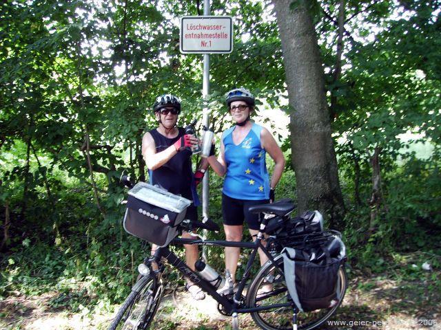 Am 24.07.2006, pünktlich um 9 Uhr, starteten wir zu dritt zu unserer Wochentour. Entlang der gewohnten Wege ging es über Steinbach, Oberempfenbach und Rottenegg nach Geisenfeld. Hier fuhren wir auf dem Radweg nach Manching. Das Wetter war bestens: Strahlender Sonnenschein und sehr warm. Entlang des Donauradweges sollte es weiter gehen. Wir verfuhren uns aber leicht und gelangten daher auf einem anderen Weg nach Ingolstadt, wo wir dann den Donauradweg fanden und ihm hauptsächlich auf Kiesstraßen durch Wälder bzw. die Donauauen weiter Richtung Neuburg folgten.
