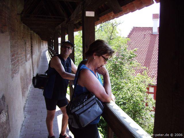 Im Fremdenverkehrsamt ließen wir uns gleich ein Zimmer im Gasthof Goldener Hirsch mitten im Ortszentrum geben und erkundigten uns nach einer Stadtführung. Schnell bezogen wir die Zimmer und machten uns fertig, da die Führung schon um 18 Uhr startete. Außer uns dreien machte noch ein Ehepaar aus Hamburg die Führung mit. Unser Stadtführer erzählte uns ziemlich viel. Er redete und redete, bis wir gegen 19.30 Uhr wirklich alles Wissenswerte über Donauwörth erfahren hatten.