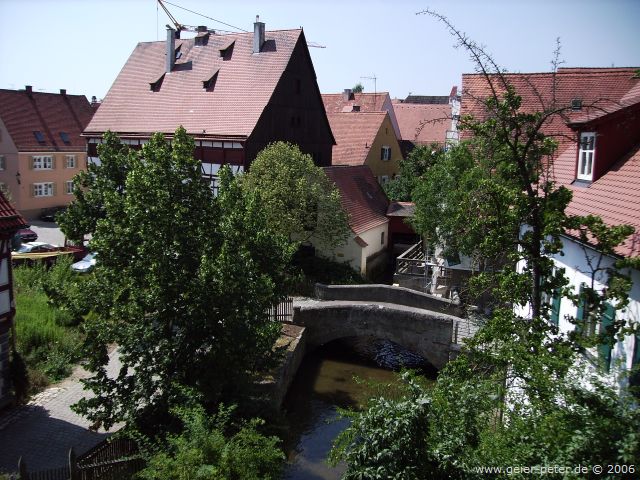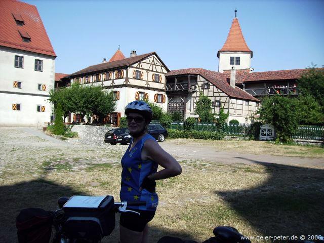 Unser Stadtführer hatte uns am Vortag empfohlen nicht auf dem Radweg entlang der Straße nach Harburg zu fahren, sondern einen kleinen Umweg über einige Anhöhen zu nehmen, da dieser Weg schöner sei. Der Radweg „Romantische Straße“, dem wir ab hier bis Würzburg folgen wollten, führte uns aber ohnehin auf dieser Strecke nach Harburg. Dort war die eigentlich sehenswerte alte Brücke voll eingerüstet, so dass wir sie weder bestaunen noch benutzen konnten. So gelangten wir über die normale Brücke auf die andere Seite des Baches. Hier führte der Radweg plötzlich steil nach oben (mindestens zwei dicke Pfeile in der Radlerkarte).