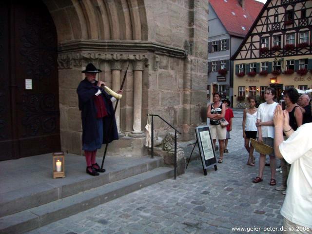 Im Fremdenverkehrsamt fragten wir nach Übernachtungsmöglichkeiten und wieder nach einer Stadtführung. Wir entschlossen uns dieses Mal in einer Pension zu übernachten. Die Privatzimmer waren zwar ca. 1,2 km von der Stadtmitte entfernt, dafür aber günstiger. Nach dem Abendessen ging es zur Stadtführung, die um 20.30 Uhr starten sollte. Es kam aber kein Führer. Wir entschlossen uns daher auf die Tour mit dem Nachtwächter zu warten. Wenigstens auf den Nachtwächter war Verlass. Er kam pünktlich um 21 Uhr und lies gleich mal sein Lied „Hört ihr Leut ich muss euch sagen, unsere Uhr hat neun geschlagen …..“ los. Dann erklärte er was ein Nachtwächter früher machen musste und wie seine Tour für uns Touristen jetzt aussieht. Wir zogen mit ihm von Wirtshaus zu Wirtshaus und überall gab er sein Lied zum Besten. Dafür gab es jedes Mal ein Glas Wein und manchmal Bier sowie Apfelschorle für die Kinder. Den Wein trank er aber nicht selbst, sondern gab ihn an uns weiter.