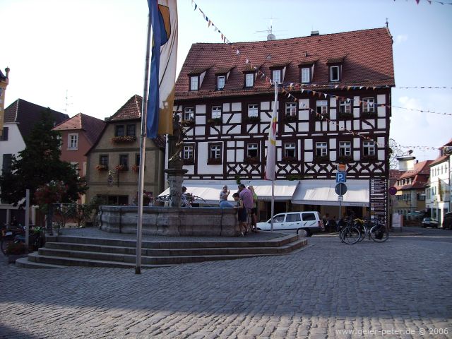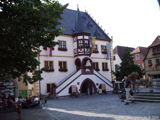 Mit etwas Verspätung verließen wir Würzburg und fuhren immer den Main entlang über Ochsenfurth nach Kitzingen. In Dettelsbach machten wir Halt und aßen zu Mittag. Weiter ging es dann nach Volkach, das wir nach 71 Tageskilometern erreichten. Die Information war nur am Vormittag geöffnet gewesen, die Zimmersuche wurde damit etwas schwieriger. Noch dazu war heute Samstag und anscheinend waren viele Gäste in Volkach. So fanden wir erst nach längerer Zeit ein Doppelzimmer für Maria und Siggi und für mich in einer Pension ein großes Zimmer, das auch als Einzelzimmer vermietet wurde.