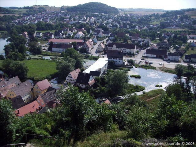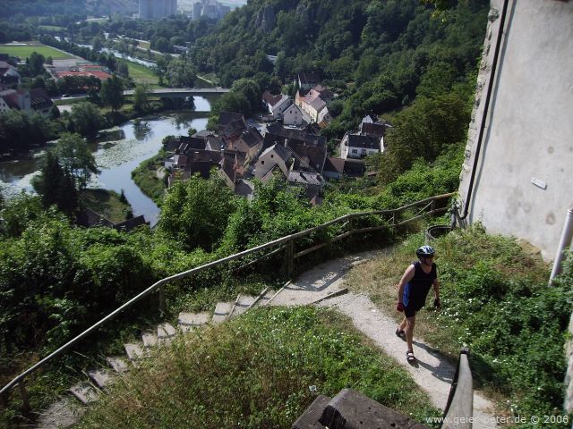 Wir schwitzten ganz schön und waren heilfroh, als wir nach einigen hundert Metern eine Kurve und damit einen etwas flacheren Teil des Weges erreichten. Nach einer kurzen Wasserpause fuhren wir dann aber noch zum Harburger Schloß hoch. Von hier aus hatten wir die beste Aussicht über die Dächer der Stadt.