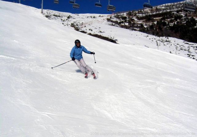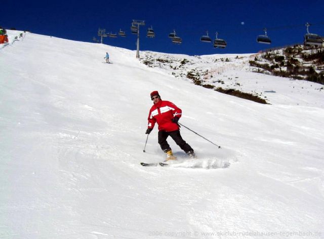 Christine und Heike, unsere Busleiterinnen, besorgten die Liftkarten. Schnell hatten wir unsere Ausrüstung angezogen und starteten mit den 8-er Gondeln der Horbergbahn nach oben. Auf der rechten Seite blitzten die weißen Hänge des Horberges zu uns rüber. Natürlich fuhren wir mit der 6-er Sesselbahn gleich weiter nach oben. Für die erste Abfahrt hatten wir uns die breiten, nicht zu steilen Hänge an der 6-er Sesselbahn Unterbergalm ausgesucht. Die Piste war griffig und super präpariert, so dass wir sie gleich nochmals runter fuhren, bevor wir zur Abfahrt an der Gerentbahn wechselten. Jetzt waren unser Muskeln warm und es war Zeit für die schwarze Abfahrt „Devils Run“ geworden. Natürlich bewältigten wir sie problemlos, zumal sich außer uns fast niemand auf dieser Piste befand. Sie war einigen wohl doch zu steil.