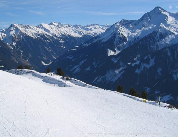 Der Sonntag begann wieder mit Sonnenschein. Es gab ein reichhaltiges Frühstücksbüfett, bevor wir um 9:00 Uhr unsere Sachen im Bus verstauten und zur Horbergbahn fuhren. Oben am Berg war wieder zuerst der Horberg dran. Als Peter fragte wo die anderen hinfahren wollten, sagte Joe nur „Meter machen. Fahr los, wir fahren hinterher“. So „stürzte“ ich mich gleich den „Devils Run“ runter. Schon bald merkte ich, dass mir die anderen nicht folgten. Die schwarze Piste war für den Anfang einigen wohl zu steil. Unten am Lift trafen wir aber wieder alle zusammen. Hoch ging es dieses Mal mit der 4-er Sesselbahn Lärchwald. Dann fuhren wir quer ans Talende zur Gondelbahn „150-er Tux“, da wir auch die Pisten am Rastkogel ausprobieren wollten. Oben angekommen bemerkten wir als erstes, dass hier ein ziemlicher Wind wehte. Entlang der 6-er Sesselbahn Wanglspitz fuhren wir bei „Gegenwind“ fast „Schuss“ runter. Dann fuhren wir nochmals hoch und wollten zur 8-er Sesselbahn Horbergjoch. Hier bemerkten wir aber bald, dass es die normale Piste dieses Jahr nicht gab. Dort lag kein Schnee. So wurden wir über einen Ziehweg zur Talstation dieser Sesselbahn geleitet.