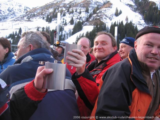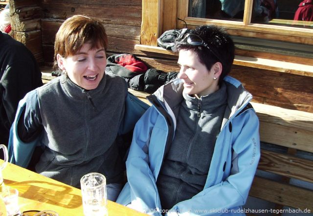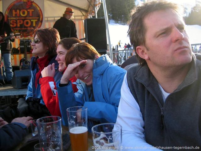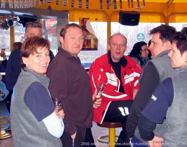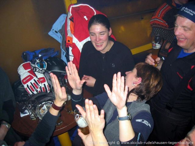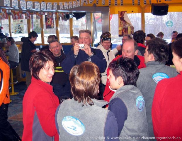 Schon bald brachen wir aber wieder auf und fuhren zur 6-er Sesselbahn Knorren runter. Oben fuhren wir dann noch ein paar Mal die Abfahrten am Penken runter bevor wir uns alle wieder auf der Terrasse des Bergrestaurants Horberg einfanden. Heute fuhren wir schon um 15 Uhr ins Tal, da wir in der Yeti-Bar noch Station machen wollten und der Bus schon um 16 Uhr losfahren sollte. Um dieses „frühe“ Uhrzeit war in der Yeti-Bar noch nicht zuviel los, aber die Skiclub-Mädels brachten doch Stimmung rein. Es gab ein Schnäpschen vom Skiclub und als Musikwunsch den „Lassosong“ zu dem unsere Skiclub-Mädels mitsangen und tanzten.