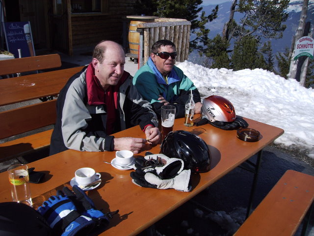 Schon nach 45 Minuten ging es wieder los. Mit der Holzalm-6-er Sesselbahn fuhren wir doch, dann mit dem 8-er Jet auf den Pfaffenbühel. Runter fuhren wir auch dieses Mal auf der schwarzen, inzwischen schon ziemlich sulzigen, Abfahrt. Anschließend fuhren wir mit dem Zillertal Shuttle Richtung Hochzillertal auf den Marchkopf. Hier fuhren wir zum Wedelexpress runter und gleich nochmals hoch, da der Schnee hier wieder viel besser als in Hochfügen war. Beim zweiten Mal „musste“ Georg ins Gelände und ich war natürlich auch dabei. Unten trafen wir wieder mit Siggi zusammen. Jetzt fuhren wir ein paar Mal die Abfahrten am Sonnenjet, bevor wir um 15:30 Uhr zur Neuhüttenbahn wechselten. Nach einer schnellen Abfahrt auf einer super Piste war es Zeit für eine abschließende Pause geworden. Wir machten auf der Sonnenterrasse der Kaltenbacher Skihütte halt.