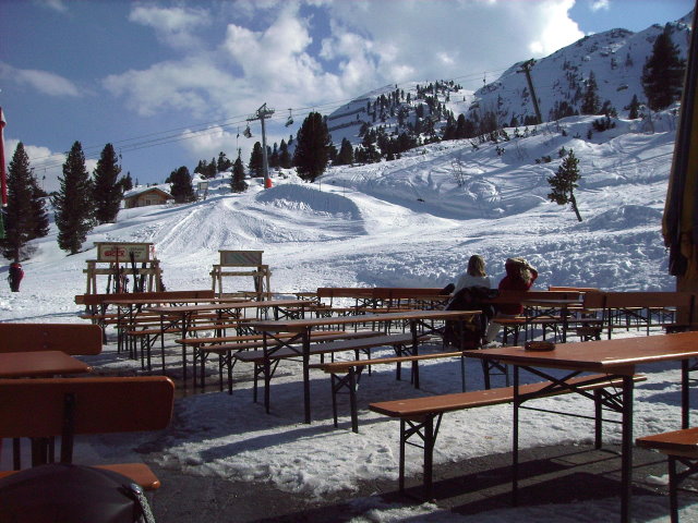 Zuerst probierten wir gleich mal die Abfahrt zur Mittelstation. Sie war zwar noch ziemlich hart, aber sehr gut zu befahren. Wieder an der Bergstation ging es zu den Abfahrten am Schnee-Express. Nachdem wir ein paar Abfahrten gefahren waren, wollte Georg zur Kristallhütte, da sie so super sein sollte. Zum Einkehren war es aber noch zu früh. So genossen wir auf der schönen Terrasse mit super Fernblick einen Kaffee. Die Bedienung war gut drauf, der Kaffee schmeckte aber nicht. Schon bald fuhren wir weiter. Nach einigen weiteren Abfahrten im Skigebiet Hochzillertal fuhren wir mit dem Sonnenjet und dem Wedelexpress auf den Marchkopf und wechselten nach Hochfügen.