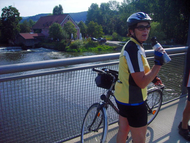 Plötzlich und völlig unvorbereitet stieg der sonst fast eben verlaufende Weg nach einem spitzen Winkel ziemlich stark an. Als Steigung waren 15% angegeben. Siggi konnte hier seine Kondition so richtig ausspielen, wohingegen Maria und ich nach einigen hundert Metern kurz abstiegen und die Räder über den steilsten Anstieg schoben. Dann stieg der Weg im weiteren Verlauf „nur“ noch mit 13% an und wir konnten wieder alle problemlos weiterfahren. Am Ende der Steigung angekommen war schon die Abfahrt in Sicht. Hier ging es mit einem Gefälle von 22% runter. Zum Glück mussten wir auf dieser Seite nicht hochfahren. An der Wallfahrtskirche Heilbrünnl machten wir kurz Halt, dann ging es aber weiter den Berg runter nach Roding.