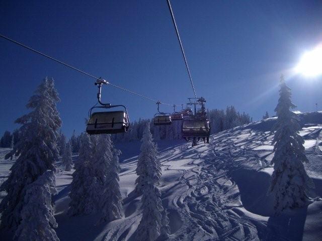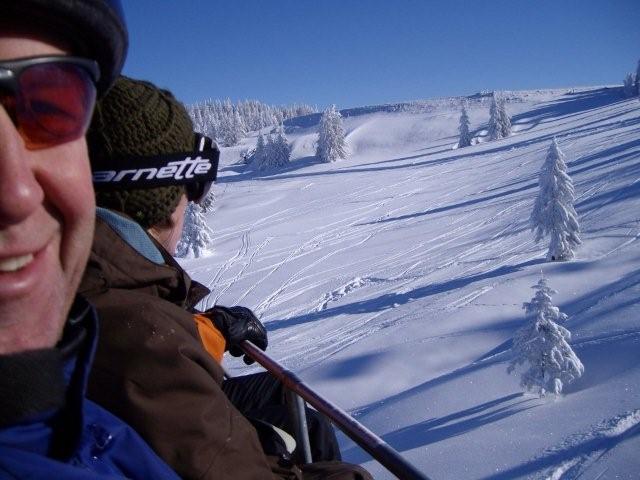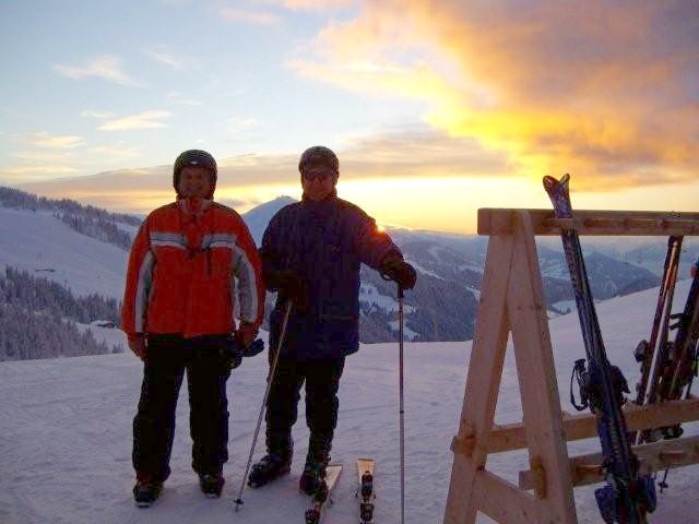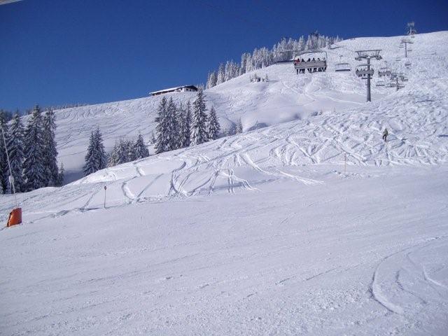 Die leichte Abfahrt zur Eibergbahn nutzten wir um uns langsam für die neue Skisaison einzuschwingen. Auf den Abfahrten der Kummeralmbahn ging es dann schon schneller bzw. rasanter los. Georg und ich probierten auch einen ersten kurzen Ausflug in den unverspurten Tiefschnee. Der Pulverschnee war tatsächlich einen Meter hoch (gemessen mit meinem Skistock). Nachdem wir einige Mal auf diesen Pisten gefahren waren, wechselten wir zur Muldenbahn. Auch hier fuhren wir in den Tiefschnee. Ich hatte gerade nochmals Glück, da ich oben ziemlich weit nach rechts gefahren und dabei fast auf der falschen Seite des Hanges abgefahren wäre. Zum Glück merkte ich es noch rechtzeitig und mußte nur 10 Meter im Tiefschnee aufsteigen. Die Abfahrten waren auch hier super.