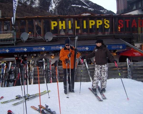 Im Apres-Ski-Lokal „Philipp“ machten wir Halt und fanden schnell einen leeren Stehtisch unter einem beheizten Schirm. Bei Apres-Ski-Hits feierten wir bis es Zeit zur Talabfahrt wurde.