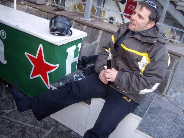 So war für unsere Gruppe klar, dass die erste Abfahrt des Tages auch die letzte sein würde. Alle machten beim „Philipp“ halt, nur ich fuhr allein nochmals nach oben. Dieses Mal fuhr ich auf der anderen Abfahrt runter. Hier auf der zum Teil schwarz ausgeschilderten Abfahrt war fast niemand unterwegs. Aber da es jetzt zu schneien anfing kehrte auch ich beim Philipp ein und wir machten am selben Tisch wie am Tag zuvor Apres-Ski, nur schon früher.