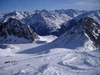Unsere Gruppe fuhr jetzt Richtung Giggijoch ab und gleich mit der 6-er Langegg zum Rotkogljoch (2660m) hoch. Peter wusste noch, dass es am Schwarzkogl eine schwarze, gut zu befahrende Abfahrt gab. So musste unsere Gruppe natürlich zu dieser Abfahrt, die wir über die Einzeigerbahn erreichten. Die Schwarzkoglbahn brachte uns um 400 m nach oben auf wieder fast 3000 m. Die Abfahrt war auch hier bestens präpariert. So fuhren wir gleich zweimal die breite, etwas steilere Abfahrt runter.