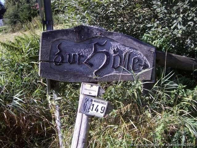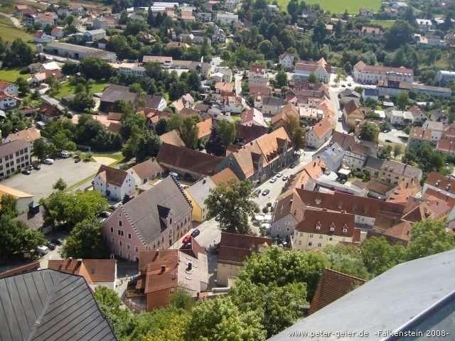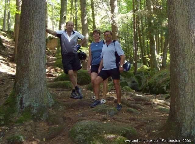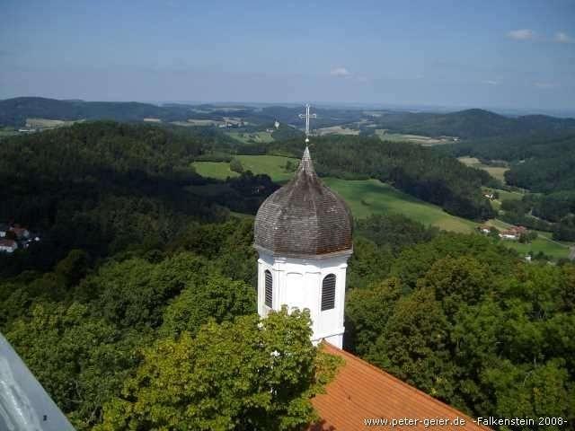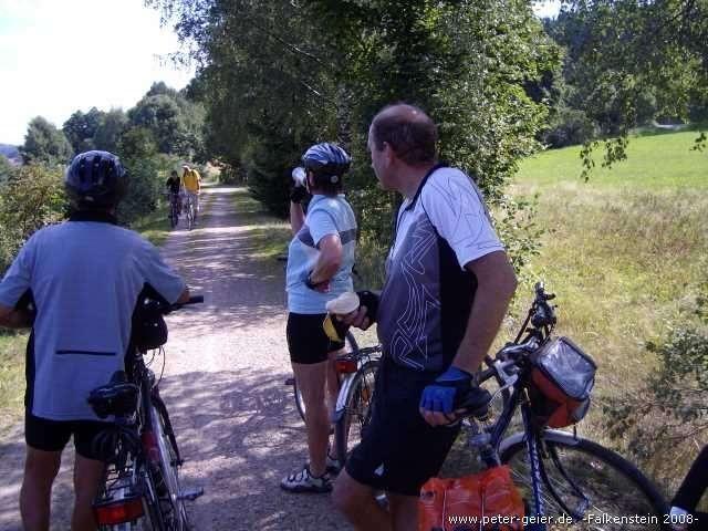 Der immer gleichmäßig ansteigende Radweg (teilweise geschottert, teilweise geteert) führte jetzt durch Wäldchen und wenige kleine Orte weiter nach Hauzendorf. Hier hat der Gastwirt einen „Radlerbahnhof“ (Biergarten) eingerichtet, in dem man bestimmt schön Pause machen könnte. Wir hatten aber noch einiges vor und fuhren daher weiter über Lampertsneukirchen und Rossbach nach Wald. In diesem Ort kreuzen einige andere Radwege, die z.B. zum Regentalradweg oder nach Cham führen. Unser Weg führte aber weiter auf dem Falkensteinradweg nach Schillertswiesen und Gfäll. Bis jetzt waren wir fast immer bergauf gefahren. Die Steigung war zwar nur mäßig aber dafür hatte sie nicht aufgehört. Hier in Gfäll ging es nach 31 Kilometern erstmals bergab. Es ist wirklich mal schön, wenn man das Rad einfach laufen lassen kann. Dann ging es aber wieder hoch und wir erreichten den höchsten Punkt der Strecke (605 m über Meereshöhe). Nach einer längeren Gefällstrecke sahen wir dann Falkenstein vor uns liegen.