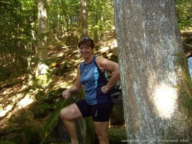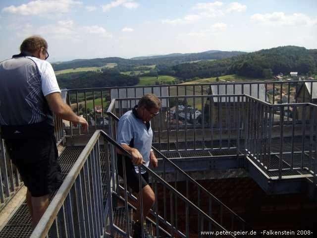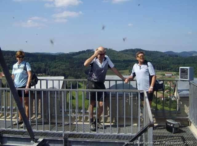 In Falkenstein fuhren wir als erstes gleich mal zur Burg hoch. Höhenunterschied 70 Meter auf sehr kurzer Distanz und somit ziemlich starke Steigung. Siggi fuhr natürlich bis oben „ohne Probleme“, wir anderen drei stiegen etwa 100 m vor der Burg ab, da die Straße sehr steil und noch dazu ab hier nicht mehr geteert war. Über Stein-, Holz- und zum Schluß Eisentreppe erreichten wir den Turm der Burg und konnten jetzt eine tolle Rundumsicht genießen.
