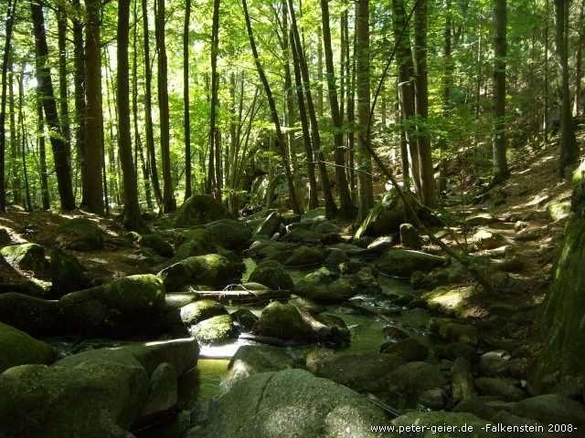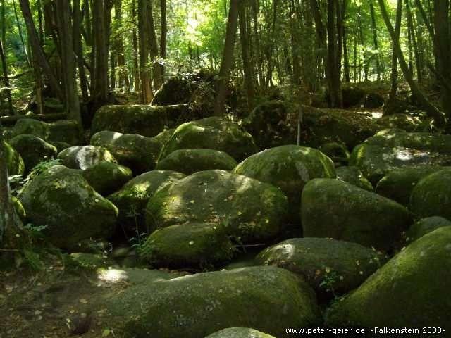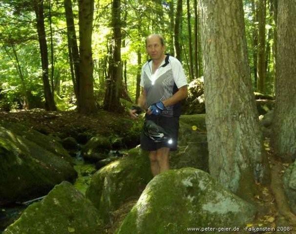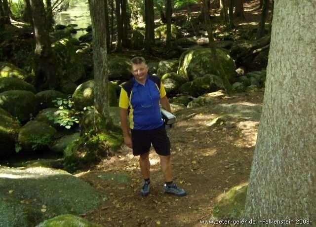 Nach der Mittagspause fuhren wir als erstes ein Stück auf dem Radweg zurück. Da wir nach Falkenstein abgefahren waren, ging es jetzt wieder ziemlich bergauf. Am Wegweiser „Zum Donauradweg“ bogen wir ab und folgten jetzt dieser Beschilderung, da wir noch das Weinbaugebiet an der Donau besuchen wollten. Schon nach einigen Kilometern zweigte rechts die Straße zum Naturschutzgebiet Höllbachtal zwischen Brennberg und Rettenbach ab. Da wir Zeit hatten wollten wir uns die sogenannte „Hölle“ anschauen. Zuerst geht man immer an einem kleinen Bächlein entlang durch normalen Wald. Der Bachlauf ist mit Steinen gesäumt, die immer größer und imposanter werden, je weiter man dem Bach folgt. Mit unseren Radlerschuhen mußte man ganz schön aufpassen, dass wir beim Klettern über die Felsen nicht ausrutschten. Nach einiger Zeit hatten wir genug gesehen und wir machten uns daher wieder auf den Rückweg.