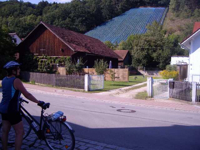 In Wiesent folgten wir den Hinweisschildern „Weinroute“ bis nach Kruckenberg. Hier war der erste Weinberg zu sehen. Wer hätte gedacht, dass es nahe bei Regensburg sowas gibt. Die ersten Weinlokale tauchten auf, die wir aber „links liegen ließen“, auch wenn es Georg schwer fiel. Er hatte schon Durst.