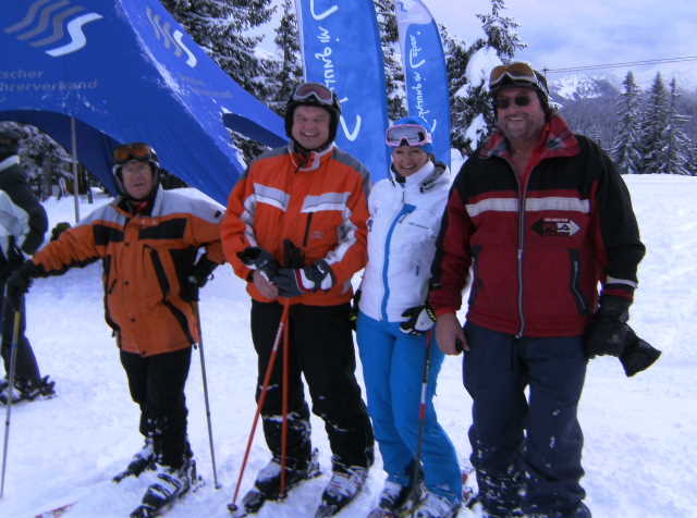 Als am Samstag schon um 7:30 Uhr das Telefon penetrant klingelte war Siggi dran: „Aufstehen, wir wollen doch einen Skilehrer nehmen“. So waren wir schon um 8:00 Uhr beim Frühstücken. Draußen schneite es so richtig. Wir stärkten uns schnell da wir trotz des Schneefalles zur Mittelstation hoch wollten um ein Angebot der Deutschen Skilehrerverbandes zu nutzen. Pünktlich um 9:00 Uhr standen wir zu dritt (Siggi, Tom und Peter) am Achter-Jet und schon ging es nach oben. Der Schneefall hörte jetzt auf. Die Sicht war schon wieder überraschend gut. An der Bergstation waren die Aktionsstände des Bayerischen Rundfunks aufgebaut.