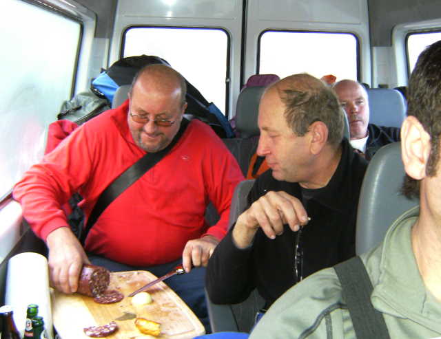 Siggi, unser bewährter Fahrer, steuerte uns wieder sicher über die Autobahn. Bei einer Pause kurz vorm Irschenberg gab es frische Brezen, kalten Braten, Geräuchertes und natürlich ein kühles Bier.