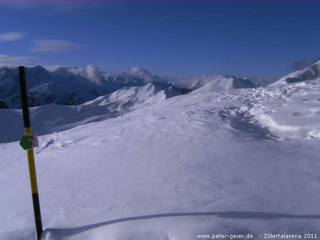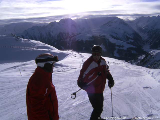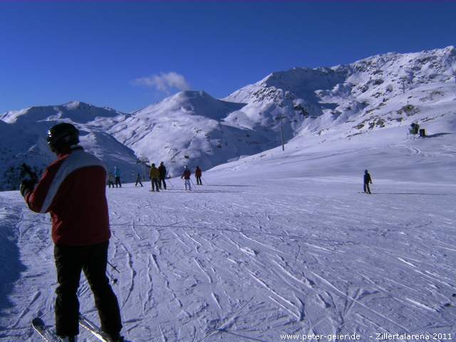 So starteten Georg, Siggi und ich kurzentschlossen zum Skifahren. Als Ziel hatte ich Zell im Zillertal mit dem Skigebiet Zillertalarena ausgesucht. Schon um 9:30 Uhr waren wir in Zell. Schnell war unsere Ausrüstung angezogen und schon fuhren wir mit der neuen 8-er Gondelbahn ganz nach oben. Wir wollten heute bis nach Königsleiten fahren und fuhren daher auch gleich zum HanserXpress und weiter zum KreuzjochXpress auf eine Höhe von ca. 2500 Meter. Hier oben war es heute sehr kalt. Minus 15 Grad. Über einige Lifte und Abfahrten ging es durch die Wilde Krimml ins Skigebiet von Gerlos.