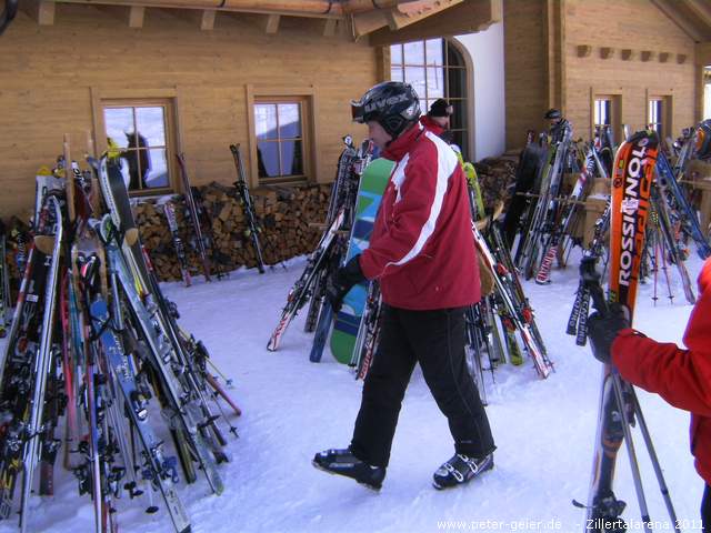 Wir fuhren gleich auf der schönen schwarzen Piste ins Krummbachtal runter. Mit dem FussalmXpress ging es zur neuen Falschbach-8er-Gondelbahn. Oben angekommen verfuhren wir uns leicht und landeten an der Talstation der Bahn Königsleiten 2000. So fuhren wir eben von dieser Seite aus nochmals auf die Königsleitenspitze, bevor wir Richtung Larmachalm abfuhren. Da Georgs Füße und Finger einfach nicht warm wurden, beschlossen wir dort Rast zu machen und uns aufzuwärmen. Nachdem es auch schon 10:30 Uhr war, legten wir gleich die Mittagspause ein.