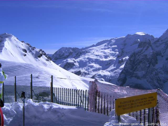 2.Tag – Dienstag – : Heute wollten wir die Sella Ronda machen. Deswegen waren wir auch schon um 8 Uhr beim gewohnt guten, ausgiebigen Frühstück. Wir fuhren dieses Mal nach Wolkenstein und parkten im Parkhaus direkt beim Lift. Wir fuhren gleich zum Ciampinoi hoch und dann weiter über mehrere Sesselbahnen ins Skigebiet von Campitello. Weiter ging es dann ins Gebiet von Canazei. Wie befürchtet staute sich hier an einem Lift, den wir unbedingt benötigten, alles. So mußten wir ca. 20 Minuten anstehen, bevor wir mit diesem Lift auf den „Rif sas Bece“ fahren konnten. Von hier aus geht es dann in einer langen Abfahrt nach Arabba hinunter.