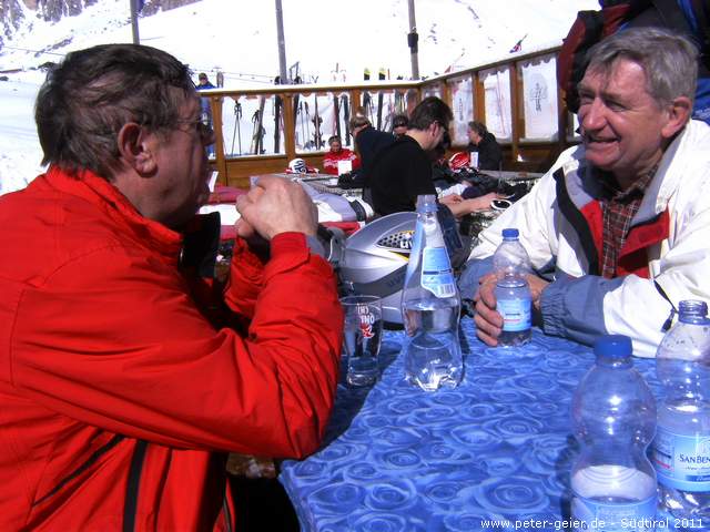 Wieder oben am Ciampinoi fuhren wir zum Plan de Gralba hinunter und dort gleich mit der Großkabinenbahn auf den Piz Sella hoch. Der Abfahrt folgten zwei Fahrten zum Piz Seteur und dann nochmals eine Fahrt auf den Piz Sella. Jetzt wechselten wir erneut zum Ciampinoi, wo wir unsere Mittagspause einlegten. Es gab natürlich gute Pasta und Georg aß welche mit reichlich Knoblauch. Das roch man noch den ganzen Tag.