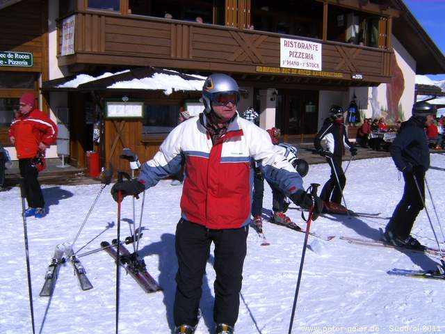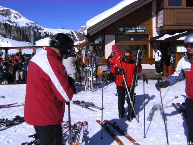 Zuerst war aber ein kurzer Halt angesagt. Siggi hatte Durst. Er kaufte sich einen Liter Wasser und trank ihn tatsächlich auch. Wir anderen begnügten uns mit einer kleinen Flasche Wasser. Dann fuhren wir weiter nach Arabba. Natürlich mussten wir dort auf die „Porta Vescova“ hoch. Für mich ist das der beste Berg in der ganzen Gegend. Immerhin führen 3 schwarze Abfahrten jeweils ca. 800 Höhenmeter ins Tal runter. Die von uns befahrene Abfahrt war auch heute bestens zu befahren. Schöner, griffiger Schnee. Leider wollten die anderen dann aber nicht nochmals hoch, sondern weiter auf der Sella Ronda. Mit einigen Liften erreichten wir die Skihütte „Rif Bec de Roces“, wo wir schon mal eingekehrt waren. Auch heute machten wir hier Mittag. Im 1.Stock wird man bedient. Es gab sehr gute Pasta und Pizza für uns.