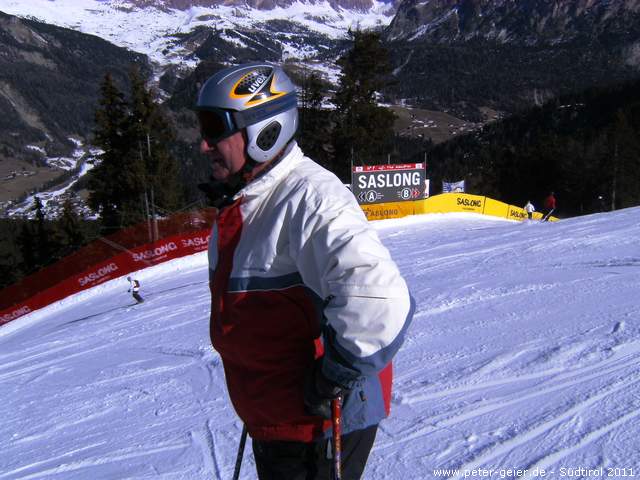Nachdem wir den Skipass gekauft hatten zogen wir unsere Ausrüstung an und schon konnte es losgehen. Wir fuhren gleich mit der Gondelbahn Saslong und weiter mit der 6-er Sesselbahn Sochers auf den Ciampinoi. Hier probierten wir bei leichtem Schneefall, aber guter Sicht gleich mal die Abfahrten an den beiden Sesselbahnen aus. Georg musste natürlich in den Neuschnee neben der Piste und ich war auch dabei. Dann war die Talabfahrt auf der Pista A, der Weltcupabfahrt Saslong, an der Reihe. Die Abfahrt war super zu befahren, wenn sich wegen des Neuschnees auch schon erste Schneebuckel bildeten.
