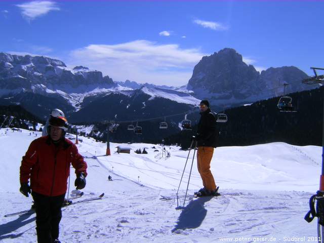 1.Tag – Montag – : Am Montag, 28.02. holte uns (Siggi, Peter und Georg) unser altbewährter Fahrer Stefan schon um 05:00 Uhr ab. Zu dieser frühen Zeit war auf den Autobahnen natürlich noch sehr wenig los. So erreichten wir, kurz unterbrochen von einer Kaffee- und Brotzeitpause in Holzkirchen, schnell die Inntalautobahn. Über Innsbruck ging es dann zum Brenner hoch. Bis jetzt war der Himmel ziemlich wolkenverhangen gewesen, im Süden tauchten aber erste Sonnenstrahlen auf. Da konnten wir ja auf einen schönen Skitag hoffen. An der Ausfahrt Klausen verließen wir die Autobahn und fuhren Richtung Grödnertal. Schon bald kamen wir nach St. Ulrich und dann nach St. Christina, dem Ziel unseres ersten Skitages.