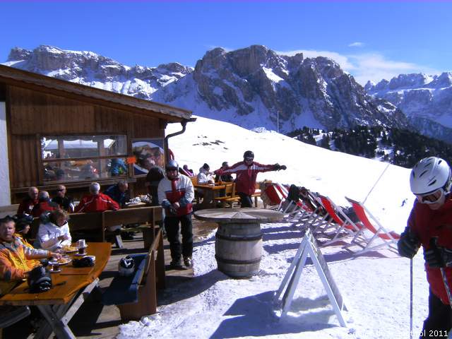 Jetzt wechselten wir mit der unterirdischen Standseilbahn auf die andere Talseite zum Col Raiser. Hier ging es mit der Gondelbahn nach oben. Nach einer Abfahrt auf der zwar kurzen aber sehr steilen Piste eines Sesselliftes fuhren wir gleich mal ins Tal nach St.Christina zurück. Die Talabfahrt war sehr leicht, aber doch schön. Der Schnee war auch hier sehr gut. Wieder oben fuhren wir zur Seceda hoch. Entlang dieser Piste gibt es mehrere Skihütten und so suchten wir uns bei der Auffahrt mit der Sesselbahn gleich mal eine passende für die Mittagspause aus. Schnell war die richtige Skihütte „Fermeda“ gefunden. Auch heute gab es wieder gute Pasta und etwas zu trinken.