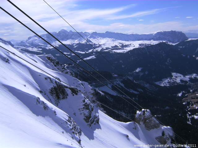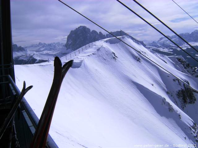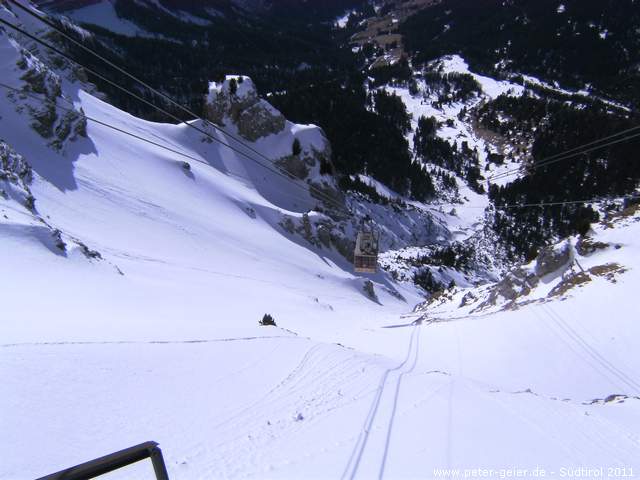 Jetzt fuhren wir nochmals nach oben auf die Seceda. Dort wurde auf die 10,5 Kilometer lange Abfahrt nach St. Ulrich angepriesen. Natürlich wollten wir auch diese Abfahrt mal fahren. So carvten wir oben auf weiten Hängen und dann weiter unten auf immer engeren Pistenabschnitten weiter, bis wir die längste Abfahrt dieser Gegend hinter uns hatten. Mit der 8-er Gondel fuhren wir dann hoch bis zur Mittelstation. Hier mussten wir in eine Großgondel umsteigen. Leider warteten hier aber schon viele Skifahrer. Aber nach 30 Minuten waren auch wir dran. Ohne eine einzige Liftstütze schwebten wir mit der Gondel direkt den schroffen Fels nach oben auf die Seceda.