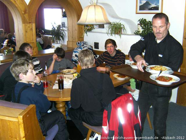 Zuerst war es jetzt aber Zeit für die Mittagspause. Unsere jungen Mitfahrer hatten Hunger. So machten wir im Berggasthof Hornboden Rast. Während wir Erwachsenen hauptsächlich Speisen mit Salat aßen, stärkten sich unsere jungen Skifahrer mit Pasta und einer süßen Nachspeise.