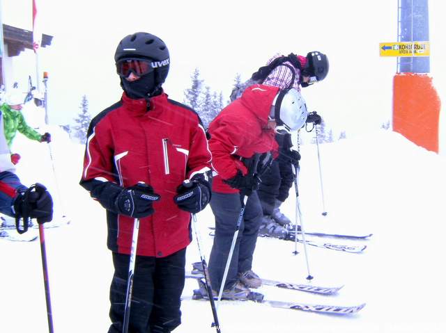 Draußen hatte jetzt Schneefall eingesetzt, aber das machte uns nichts aus. Nach einer Stunde ging es wieder los. Dieses Mal fuhren wir auf der schwarzen Abfahrt zur Widershornbahn ins Tal runter. Die Abfahrt war gut präpariert und die Sicht trotz Schneefall gut. Wieder oben ging es zur Pöglbahn runter und dann auf der roten Abfahrt noch zweimal zur Widershornbahn ins Tal.