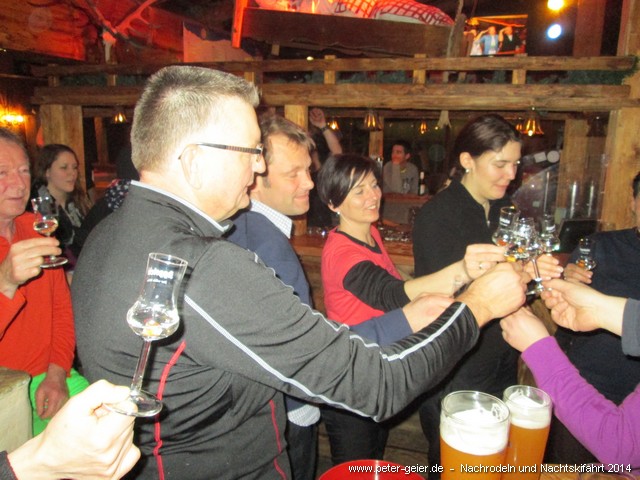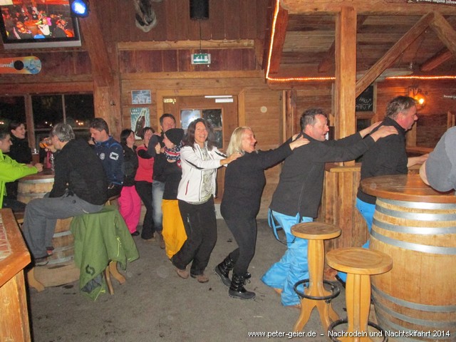 Die Skinacht war zwar zu Ende, aber jetzt war „Apres Ski“ angesagt. Wir tauschten unsere Skischuhe gegen normale Schuhe und schon ging es in die Moonlight Bar, die direkt am Parkplatz bei der Gondelbahn liegt. Hier trafen wir mit den Rodlern zusammen. Dieses Jahr war ziemlich viel los in der Moonlight Bar. Kein Wunder, wir waren ja da und sehr gut gelaunt. Der Diskjockey machte seine Sache sehr gut und spielte die Lieder, die wir wollten. Viel zu schnell wurde es 24 Uhr und damit Zeit für die Rückfahrt. – Aber wollten wir bei der Stimmung wirklich schon heim? Nein! – Also verlängerten wir kurzfristig auf 00:30 Uhr.
