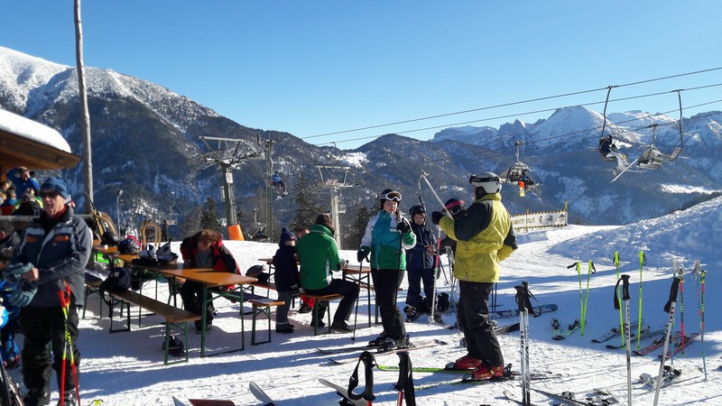 Bald merkten wir, dass heute sehr viele Skifahrer auf den Pisten unterwegs waren. Ein Radiosender hatte verbilligte Karten für den heutigen Tag verkauft. So war an den beiden Hauptliften des Skigebietes warten angesagt. Aber dafür war das Wetter und der Schnee super! Den Kindern gefiel vor allem die Fahrt über das eingegrabene Auto.