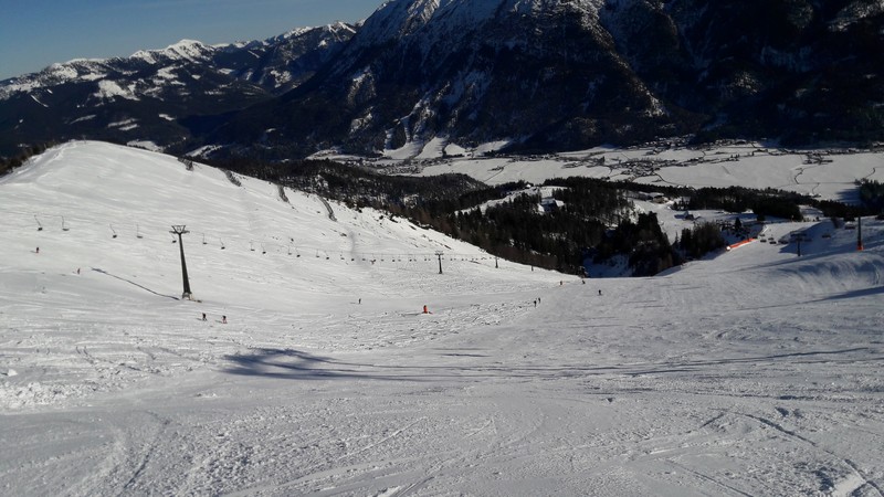 Als wir ankamen schien bereits die Sonne von einem tiefblauen Himmel. Genau um 09:30 Uhr fuhren wir dann mit der Vierersesselbahn los nach oben. Normalerweise muss man hier, zumindest nach Weihnachten und an Wochenenden, an den beiden Sesselbahnen ziemlich lange anstehen, heute war aber nichts los. Sowas von „überhaupt nichts los“ gibt es sehr selten. Wenn mal zwei Personen vor uns am Lift waren, war das schon sehr viel. Nach zwei Stunden Skifahren war es dann Zeit für eine kleine Stärkung. Offen hatte heute nur das Riederbergstüberl an der Bergstation der Vierersesselbahn. Auch hier war praktisch nichts los. Schon bald waren wir dann aber wieder mit den Skier unterwegs.