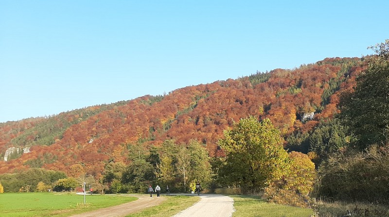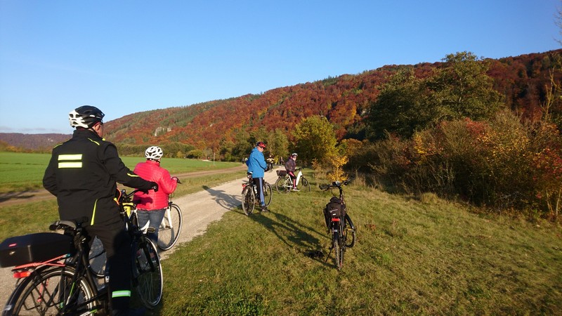 Im Hummeltal wartete dann der steilste Abschnitt des Weges, der bis nach Thann führt, auf uns. Mit den E-Bikes war der Anstieg aber kein Problem. Auf den Jurahochflächen, am höchsten Punkt der Tour, konnten wir auf die umliegenden Täler hinabblicken und die schöne Gegend genießen, da inzwischen auch die Sonne zwischen dem Hochnebel zu sehen war.