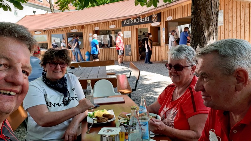 Über Willersdorf fuhren wir über Schweinbach, Irlach und Oberummelsdorf nach Train. Am Wasserschloß Train war der nächste Halt angesagt. Dann ging es weiter über Siegenburg nach Biburg, wo wir nach 27 km im schönen Klosterbiergarten eine Pause einlegten. Heute spielte hier Blasmusik und es gab eine kühle Radler mit einem guten Essen.