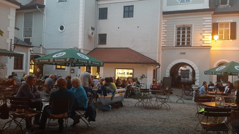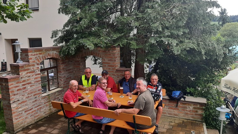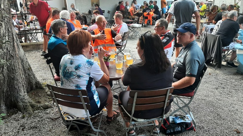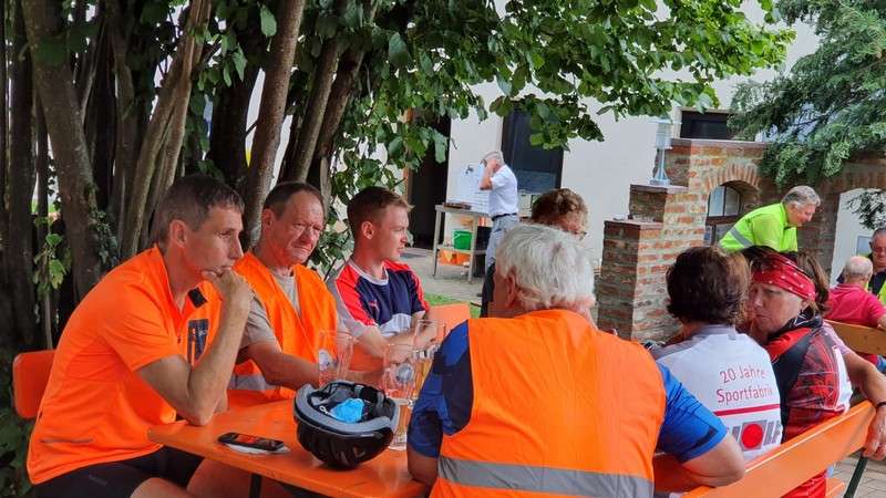 Unterwegs trafen die drei Gruppen im Biergarten in Notzenhausen zusammen. Hier gab es eine Getränkepause, bevor es dann gemeinsam die letzten acht Kilometer auf dem Radweg nach Au zum Biergarten der Schloßbrauerei Au ging.