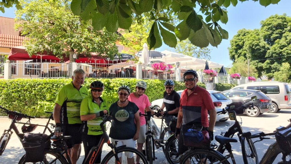 Mit drei Autos + sechs E-Bikes fuhren wir heute zu unserem Startpunkt in Regensburg-Prüfening. Per Rad ging es dann als erstes über die Eisenbahnbrücke, die über die Donau führt. Immer in der Nähe der Naab fuhren wir dann über Etterzhausen, Pielenhofen und Duggendorf nach Krachenhausen. Dort legten wir im Landgasthof Birnthaler eine Mittagspause ein.